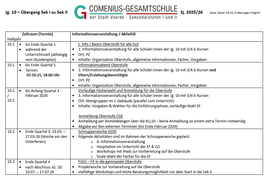 Die Beratung im Übergang von der Sekundarstufe I zur Sekundarstufe II ist uns ein wichtiges Anliegen. Die wesentlichen Eckpunkte sind dem Fahrplan „Mein Weg in die gymnasiale Oberstufe“ zu entnehmen.
